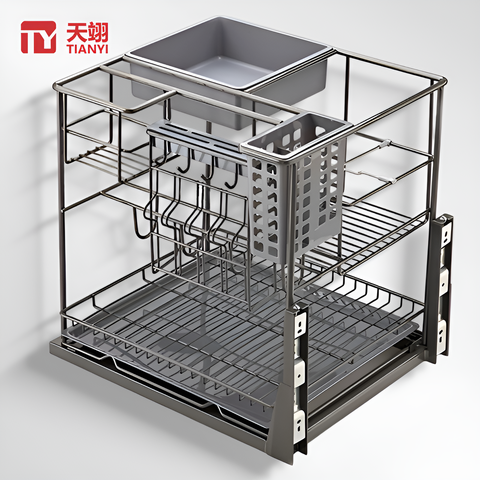 ตะกร้าอลูมิเนียมอัลลอย2ชั้นดีไซน์ทันสมัยทนทานกันน้ำดึงออกได้สำหรับเก็บของในห้องครัวที่มีประสิทธิภาพ