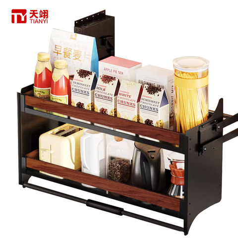 ชั้นเก็บของวอลนัทสองชั้นพร้อมตะกร้าในครัวแบบดึงลงชั้นวางด้านข้างประหยัดพื้นที่