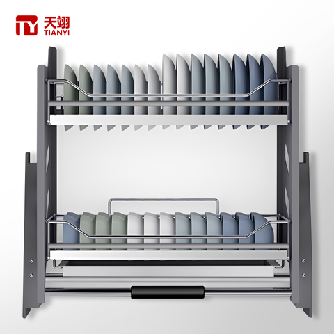 ตะกร้าใส่จานชามวอลนัทสองชั้นดีไซน์ทันสมัยปรับได้เก็บของใช้ในครัวทำจากอะลูมิเนียมอัลลอยพร้อมฟังก์ชั่นการยก